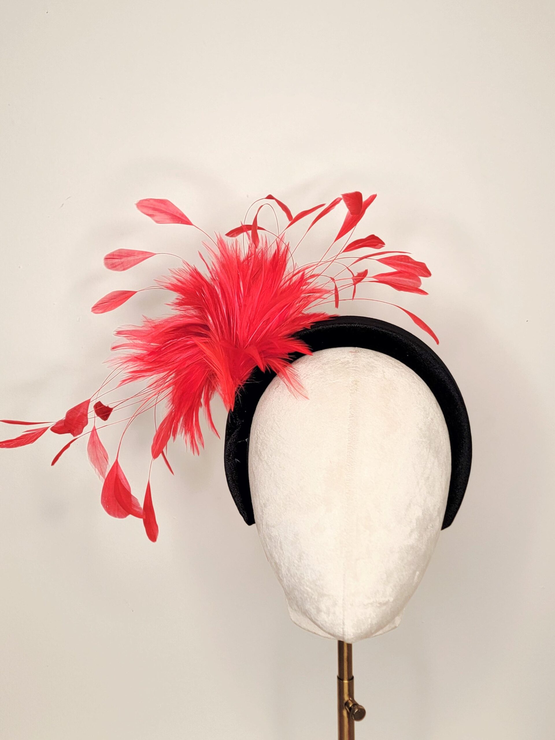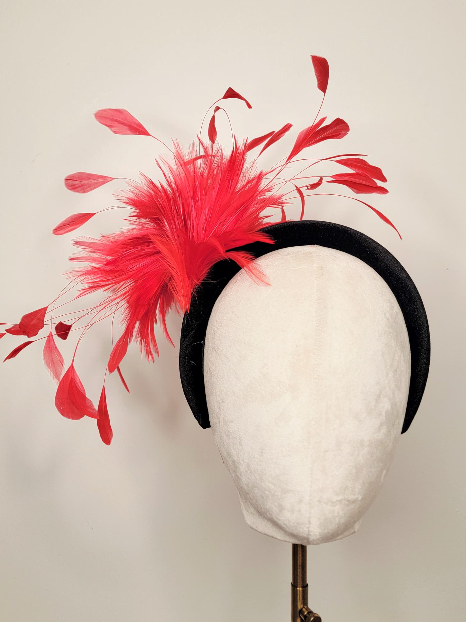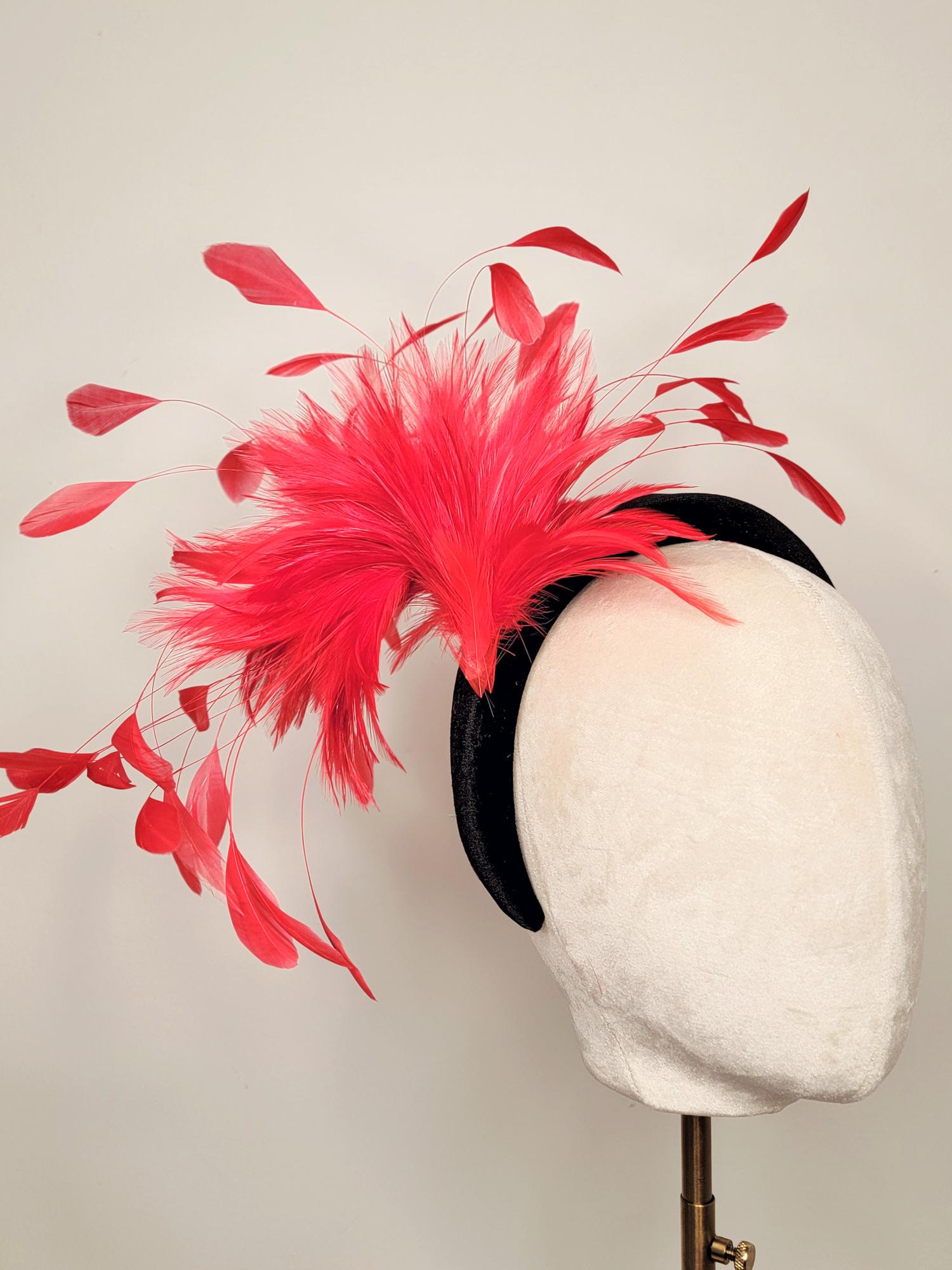 Amara is handmade and beautifully crafted by Polly Singer. A luxurious spray of red feathers cascades out from a velvet headband. Sure to garner attention from all those see Amara.