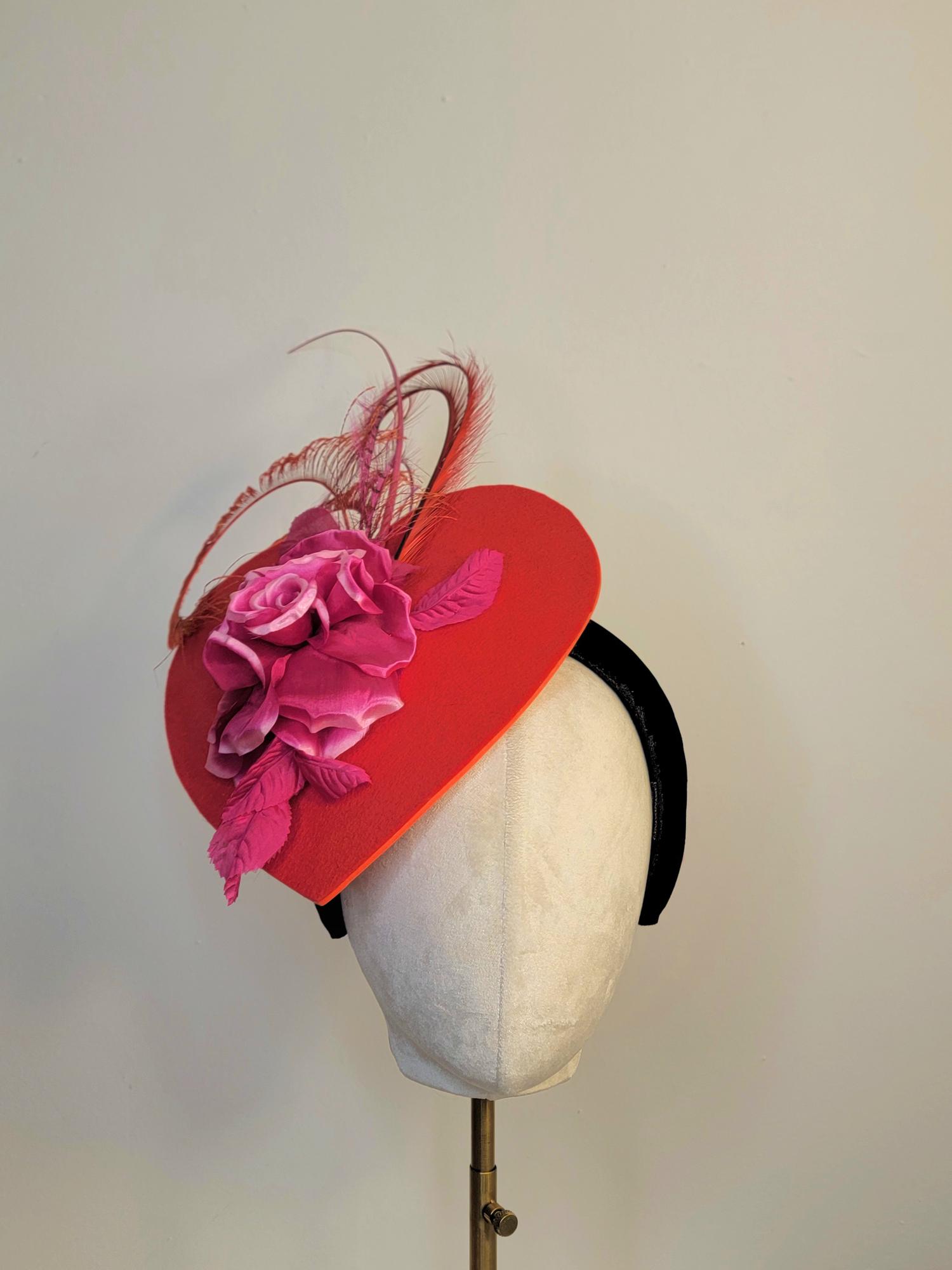 A truly romantic statement piece, this bespoke Polly Singer fascinator is lovingly hand-made and designed to captivate. Crafted around a bold red heart silhouette, it is beautifully adorned with soft pink flowers and delicate feathers that add texture, movement, and an air of elegance. Set on a comfortable headband for effortless wear, this unique fascinator balances playful charm with refined craftsmanship. Perfect for weddings, race days, Valentine’s events, or any occasion that calls for a touch of love and individuality, it is a striking accessory made to be treasured.