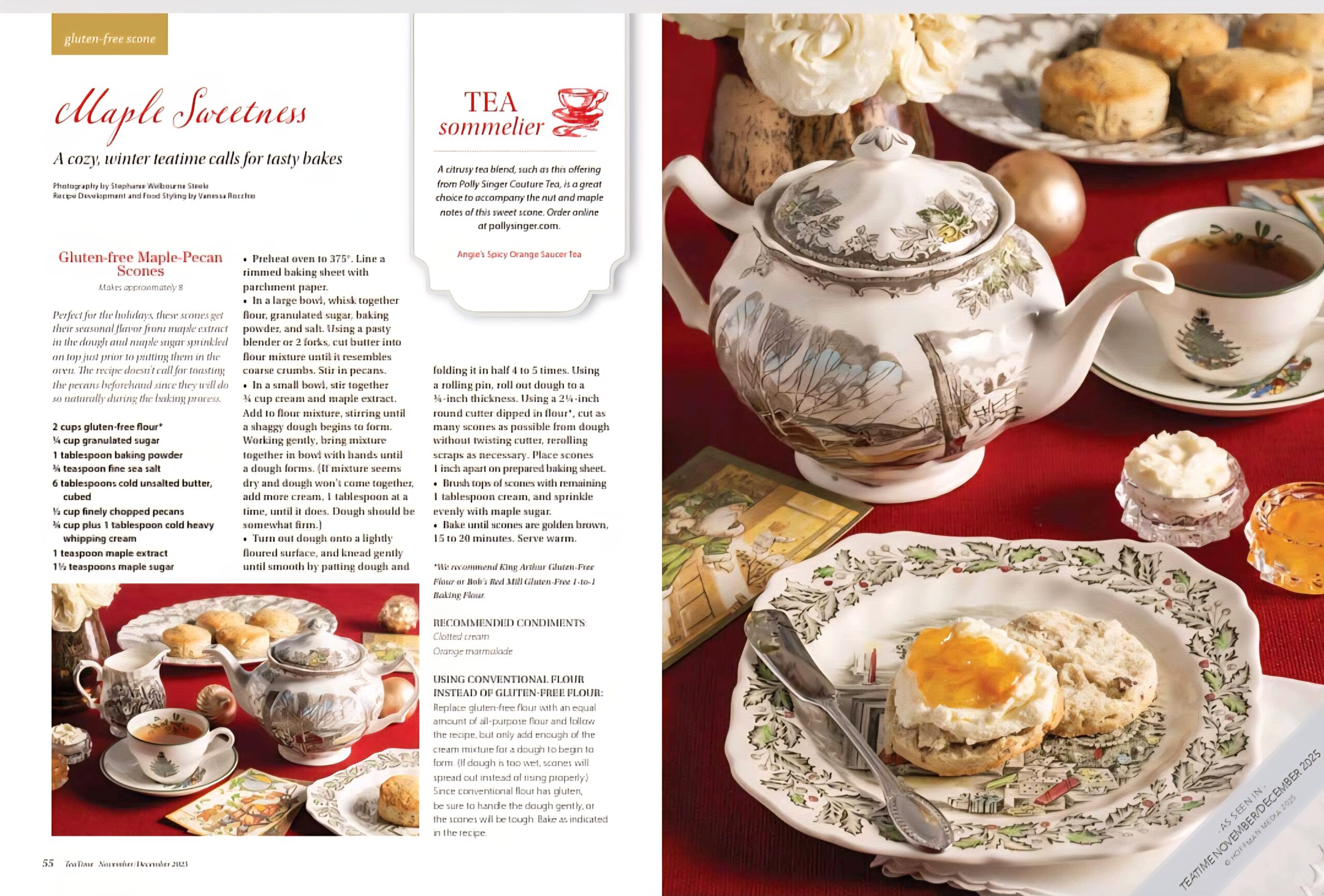 Angie’s Spicy Orange Saucer features all those nostalgic aromas and flavors that we love. This loose leaf tea was featured in the November/December 2025 issue of Tea Time Magazine as the choice to serve with Gluten-free Maple-Pecan Scones.