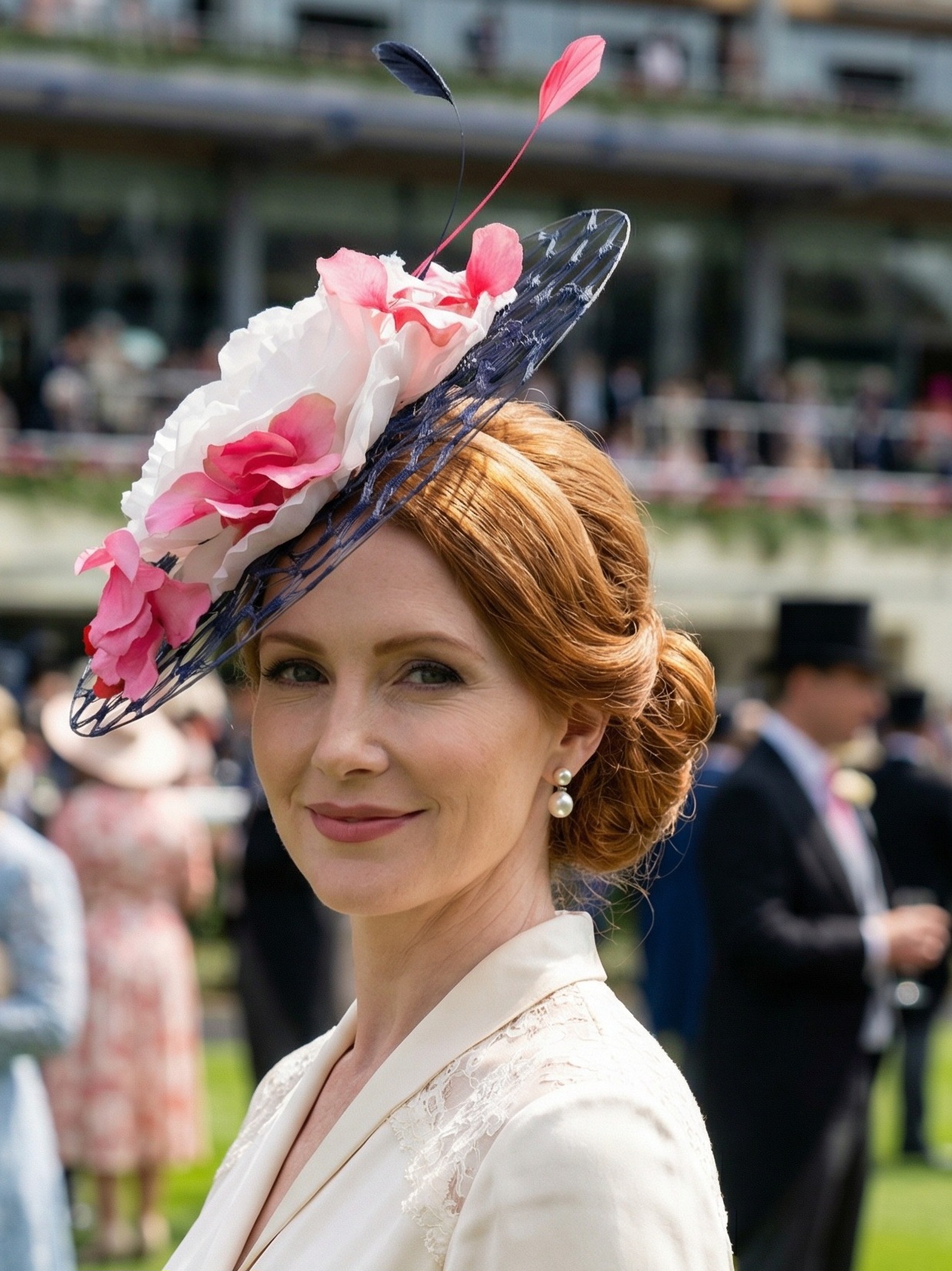 Susan is a delightful navy fascinator made from navy veiling. Trimmed with a luscious white rose and pink hydrangeas with a few feathers added, Susan is sure to make you smile! Perfect for Keeneland, the Kentucky Oaks or Derby.