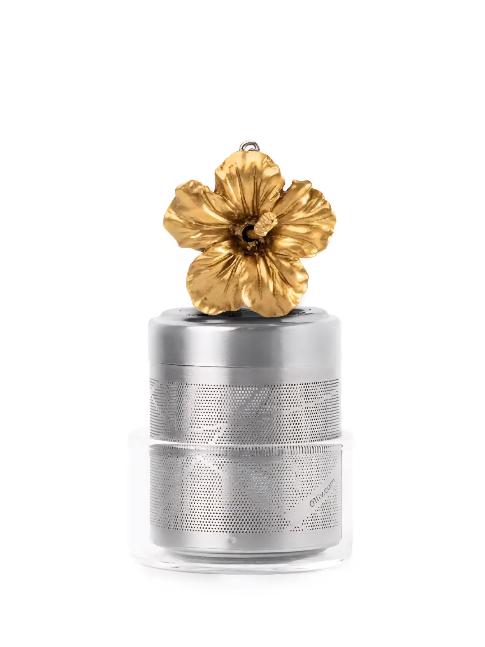 Enjoy the perfect tea experience with our stainless steel tea infuser decorated with a gold hibiscus. A stylish touch for loose teas and perfect for small leaves. The glass bowl can be used to store the infuser after the tea has been brewed.