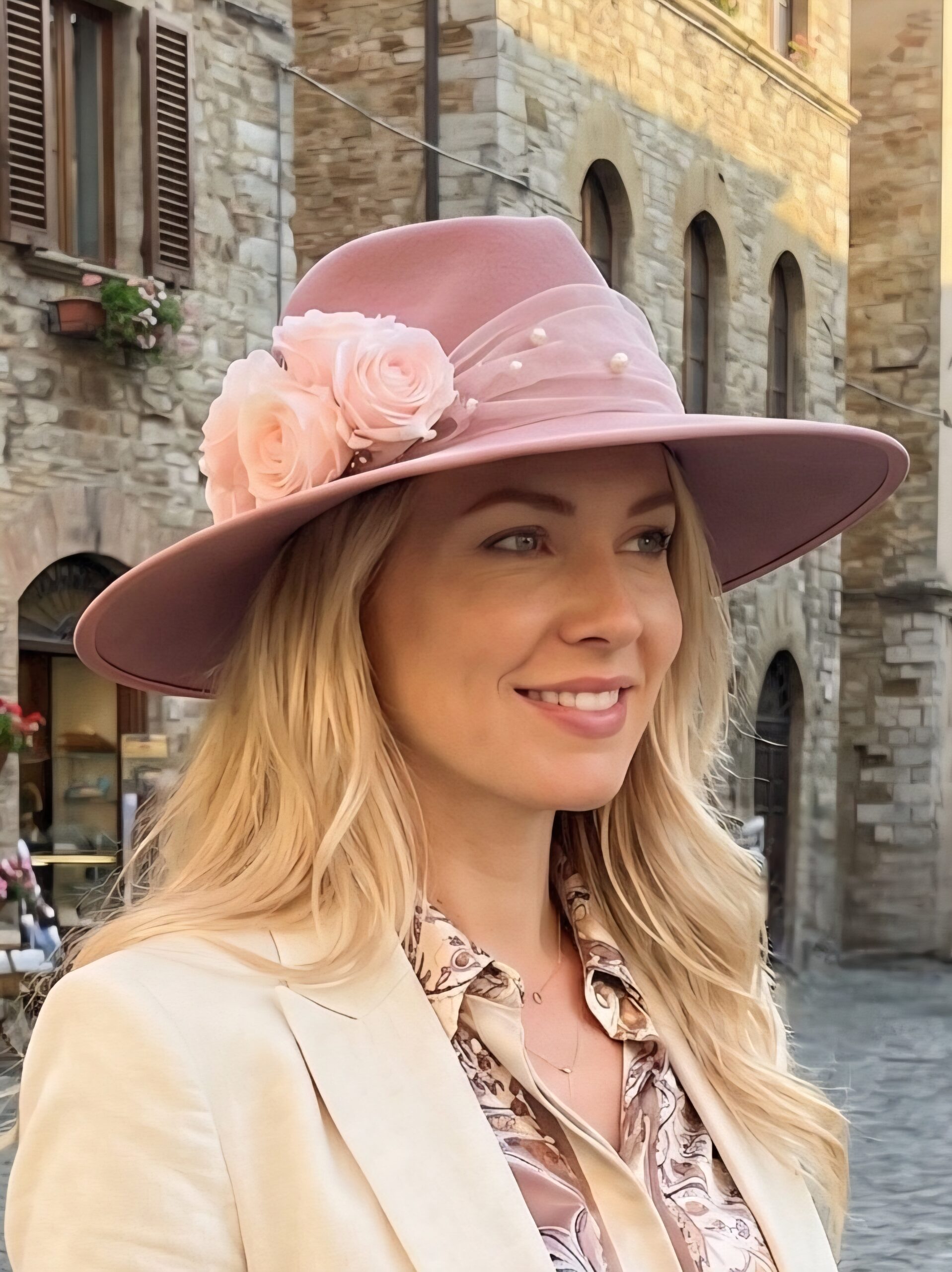 Valentina is a luxurious dusty rose wool fedora that features roses, tulle and pearls. An elegant and romantic fedora that brings out the soft feminine side of those who wear it.
