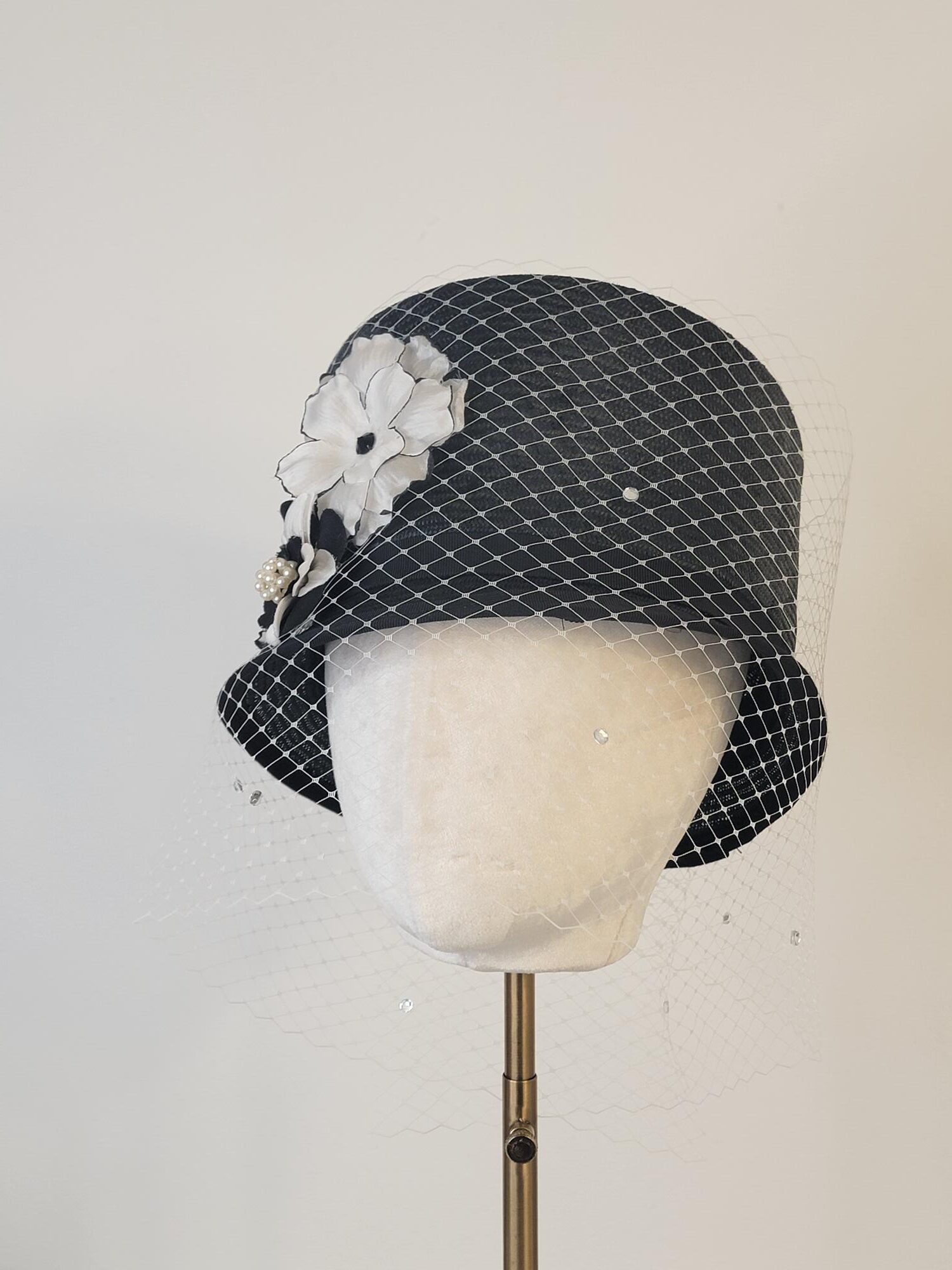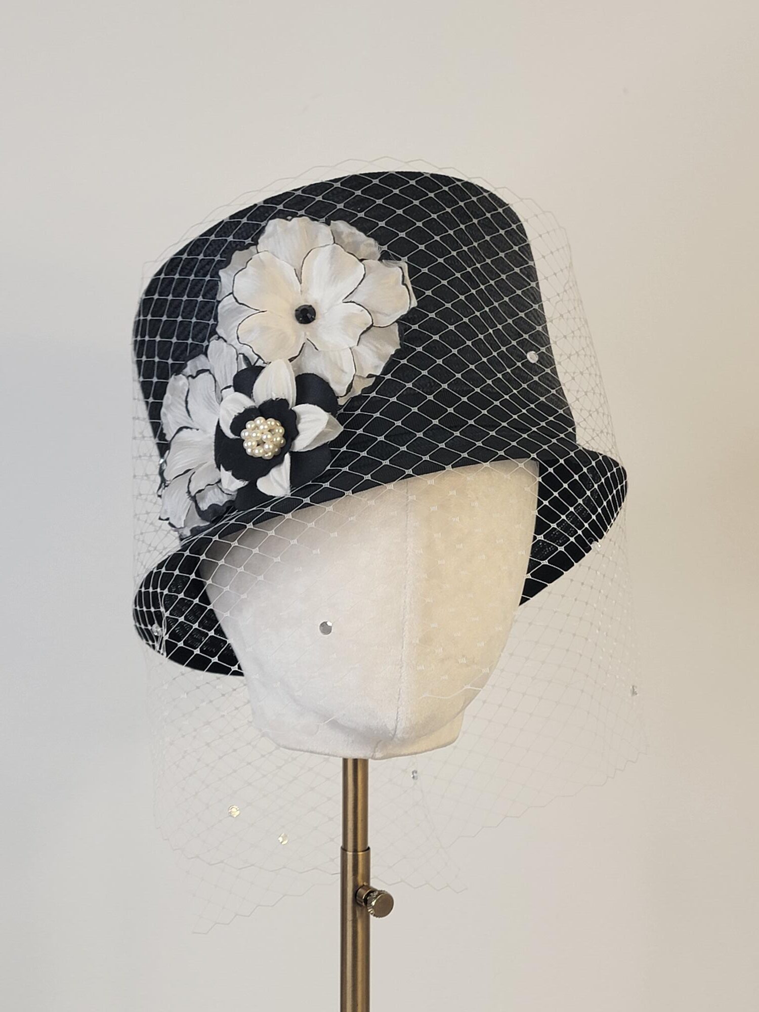 Victoria Black and White Top Hat with Diamond Veiling